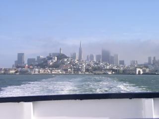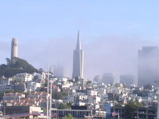 | Coit Tower (far left) and TransAmerica Tower (center). The fog cleared out, so we got some more city skyline shots. Full picture [74 KB] |